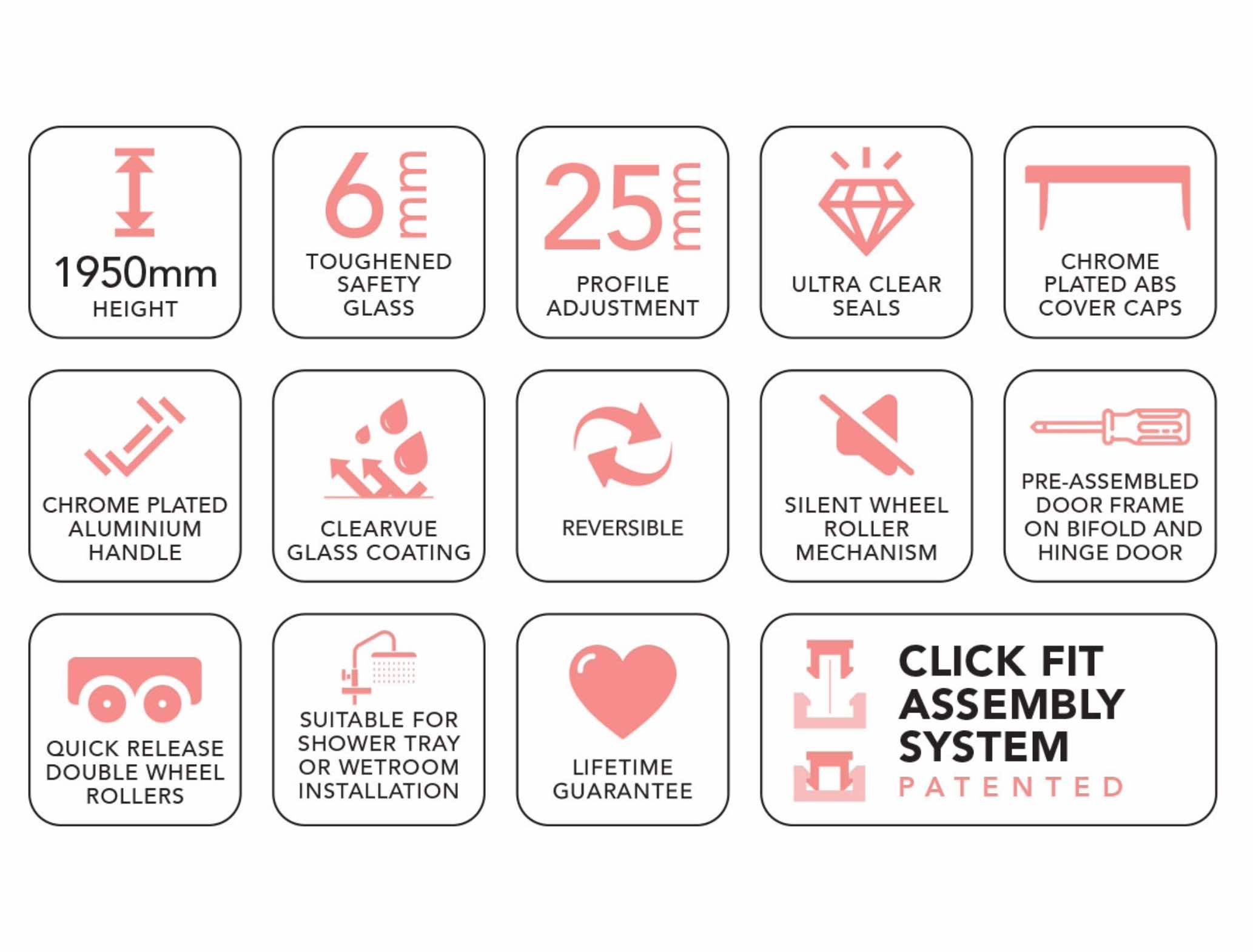 For the professional Installer an innovative Click Fit Assembly System has been developed. This allows the fitter to assemble the shower door frame quickly and without the need for fastening screws.